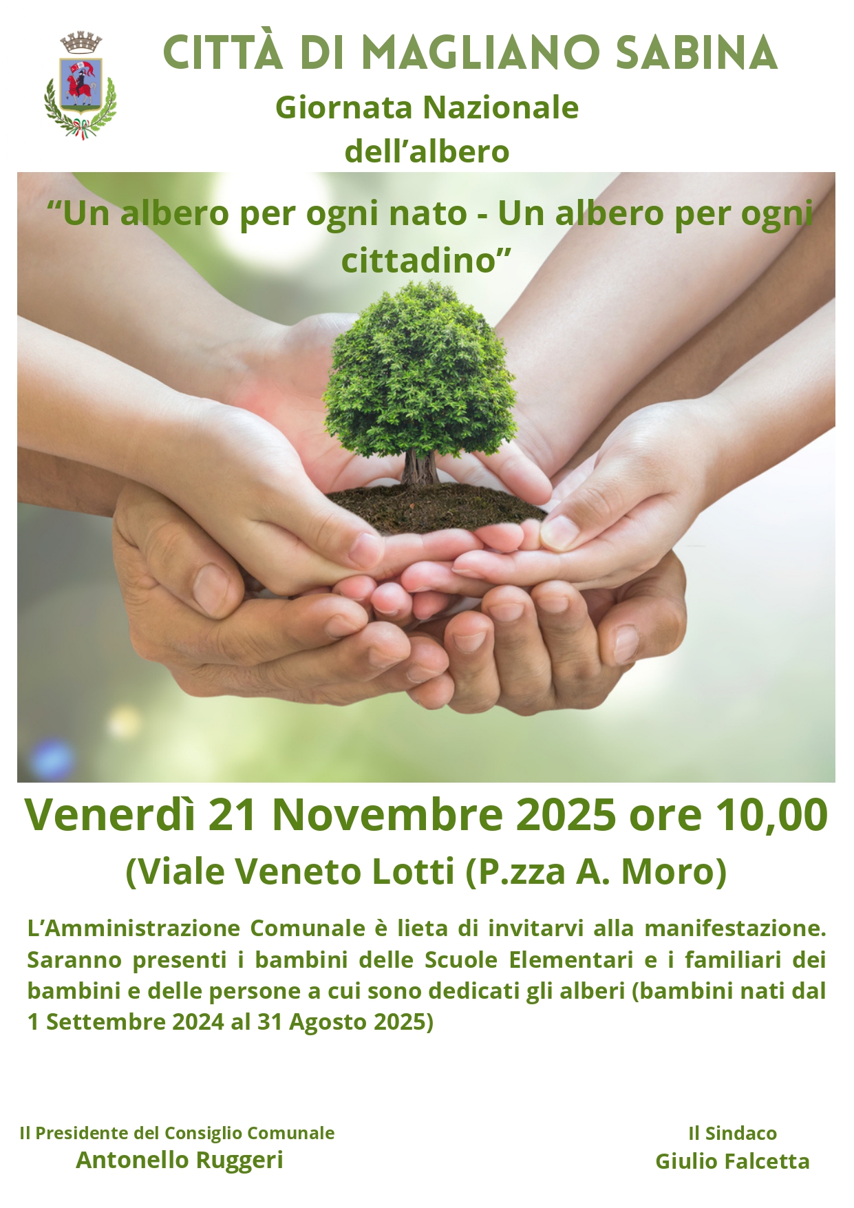 In occasione della Giornata Nazionale dell’Albero, l’Amministrazione Comunale invita la cittadinanza a partecipare alla cerimonia di piantumazione di 30 nuovi alberi, dedicati ai bambini nati tra il 1° settembre 2024 e il 31 agosto 2025 e a coloro che hanno scelto di dedicare un albero a una persona cara.